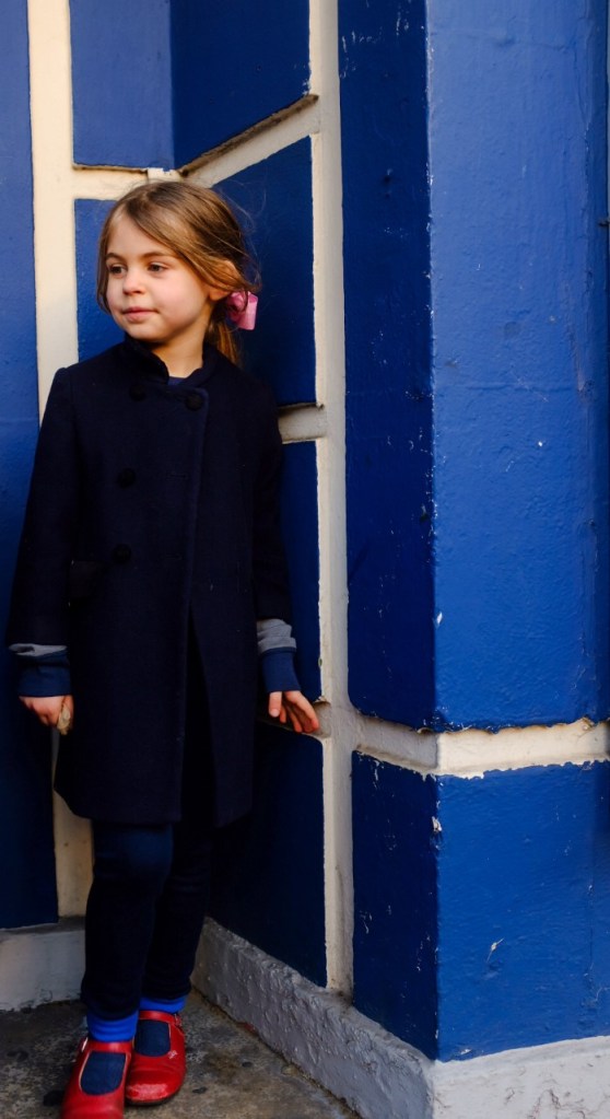 3.1.3.2 The colour I chose to photograph was blue. This is a favourite colour of mine and within my home there is a lot of blue. Using my Cannon SLR with a 50 mm lens I photographed my son wearing blue and in front of the blue backdrop. Afterwards I increased the vibrancy slightly in Lightroom so the colour would pop. I did the same with the other objects I photographed in the house. On reflection perhaps I should have decreased the exposure slightly so the colour popped more, I could have used a quicker shutter speed with the wide aperture. My shutter speed was 1/80 in one of my pictures and my kitchen is quite bright. Outside I tried to discover more blue, as I chose to photograph the sky, again this was very exposed so I maybe needed a narrower aperture and quicker shutter speed. In lightroom I could increase the whites in picture so the colour of the sky was a more vibrant blue. I loved the picture of Georgia in her blue coat standing by the blue wall, however as it was a spontaneous shot, her red shoes became more of a focus maybe!