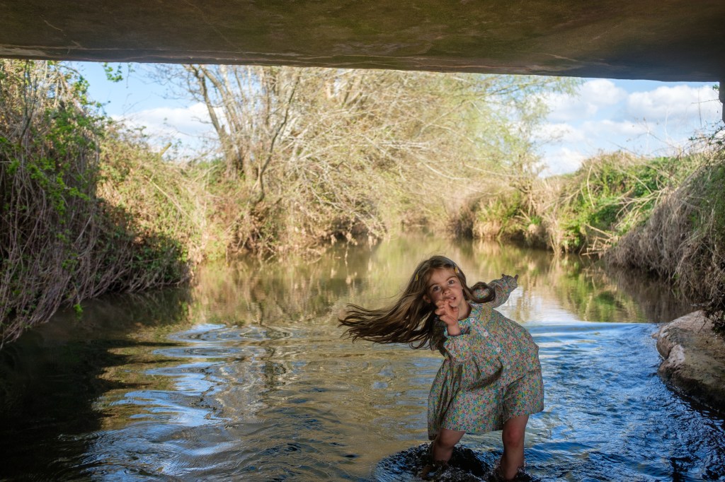 The last picture was taken when we were paddling with the children, again a real strong nostalgic feeling of home. This was my favourite picture. I thought a bridge near my dad’s house could be a good location for a picture of the children playing in the stream and it worked really well with the contrast of light and dark and highlighting Georgia playing in the water. Using a low aperture the shutter speed was needed to avoid over exposure. Like William Eggleston and Joel Sternfield there is warmth from the natural sunlight and co ordination of color with similar colours in her dress to the background. In Adobe lightroom afterwards, I increased the exposure, but brought the the highlights right down, so that the background detail was not blown out as the background in direct sunlight was so much brighter than Georgia in shade under the bridge.